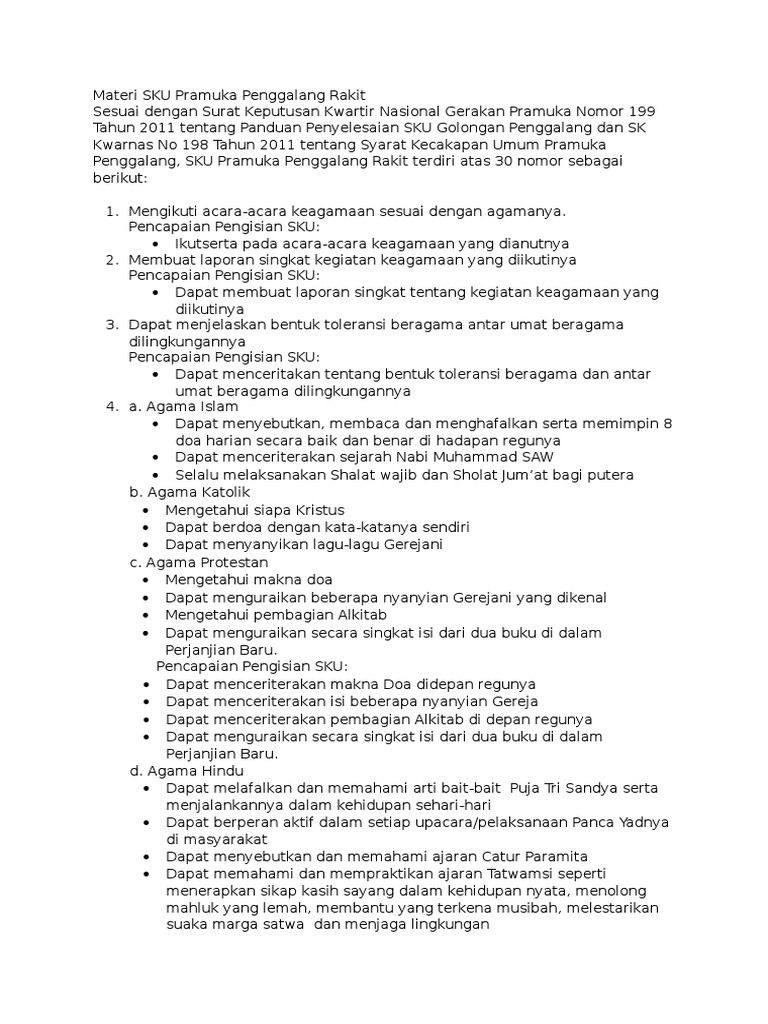 Sama dengan cara penempuhanpengujian pada tingkat penggalang ramu hanya bedanya dari segi lamanya periode berlatih. Dalam artikel ini selain memuat tentang materi syarat kecakapan umum perbutir pun disertai dengan indikator pencapaian pengisian sku dari masing masing syarat tersebut. Areal Penemba ngan Materi SKU Pencapaian Pengisian SKU Spiritual 1 Mengikuti acara-acara keagamaan sesuai dengan agamanya Ikut serta pada acara keagamaan 2 Membuat laporan singkat kegiatan keagamaan yang diikutinya.