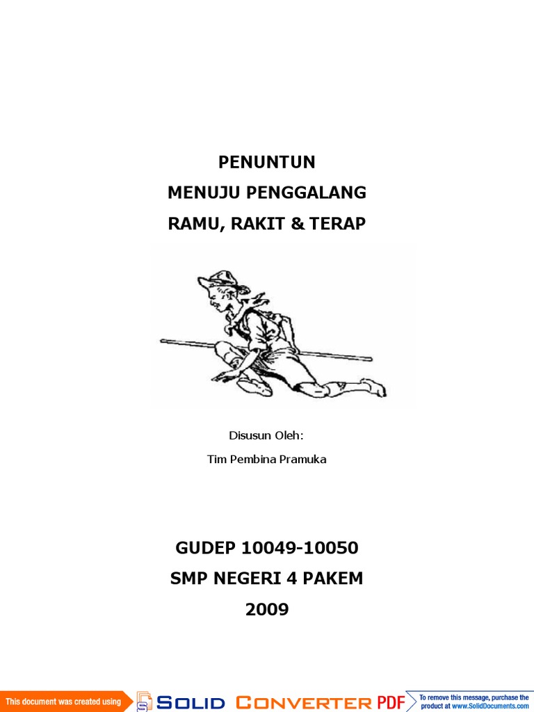 Panduan materi sku pramuka penggalang rakit berisikan panduan materi yang meliputi indikator dan pencapaian sku. Panduan ini menjadi pedoman bagi para pembina penggalang maupun bagi calon penggalang rakit dalam mempersiapkan diri menyelesaikan materi-materi uji SKU Syarat Kecakapan Umum Penggalang Rakit. Syarat-syarat yang harus dipenuhi Untuk mencapai tingkatan Penggalang Rakit seorang Pramuka Penggalang Ramu harus memenuhi syarat-syarat sebagai berikut.