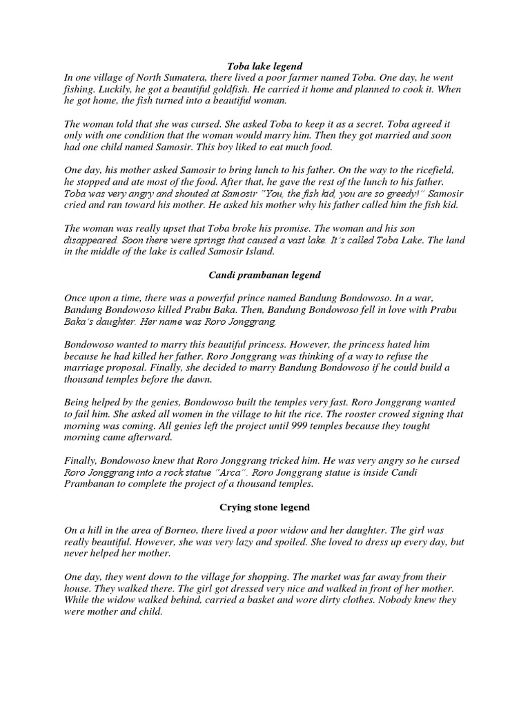 The Legend of Danau Toba In one village of North Sumatera there lived a poor farmer named Toba. Roro Jonggrang was helped by the women before the dawn. The kingdoms were the Penging kingdom and the Baka kingdom.