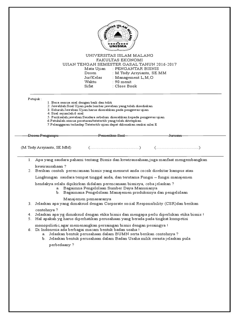 Soal dan jawaban uas mata kuliah pengantar bisnis. Hukum bisnis soal dan jawaban saturday april 21 2018. Diposting oleh Unknown di 0217.